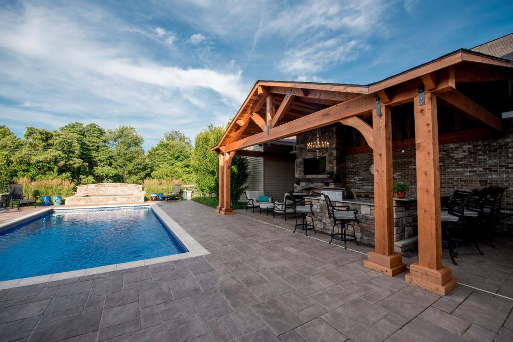 An outdoor living room will completely change the way you see your backyard. A classic trend we keep seeing is a seamless flow between your interior and exterior living space. Bringing the indoors out can enhance the comfort of your outdoor living space, maximize the use of the space, and extend its use from season to season. When creating this space, we often design them beneath a custom-built overhead structure. These structures house amenities such as premium lounge furniture, a bar and grill, fully functioning fireplace and mantel, and a dining area! We integrate smart tech features into estate outdoor lounges to create a luxury experience. Some of these features include outdoor televisions, built-in heating or cooling to assist in climate control, lighting, built in speaker systems, and so much more– the limit is your imagination! Check out our project Tranquil Haven to spark some outdoor living room ideas of your own.
