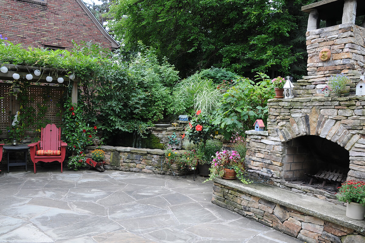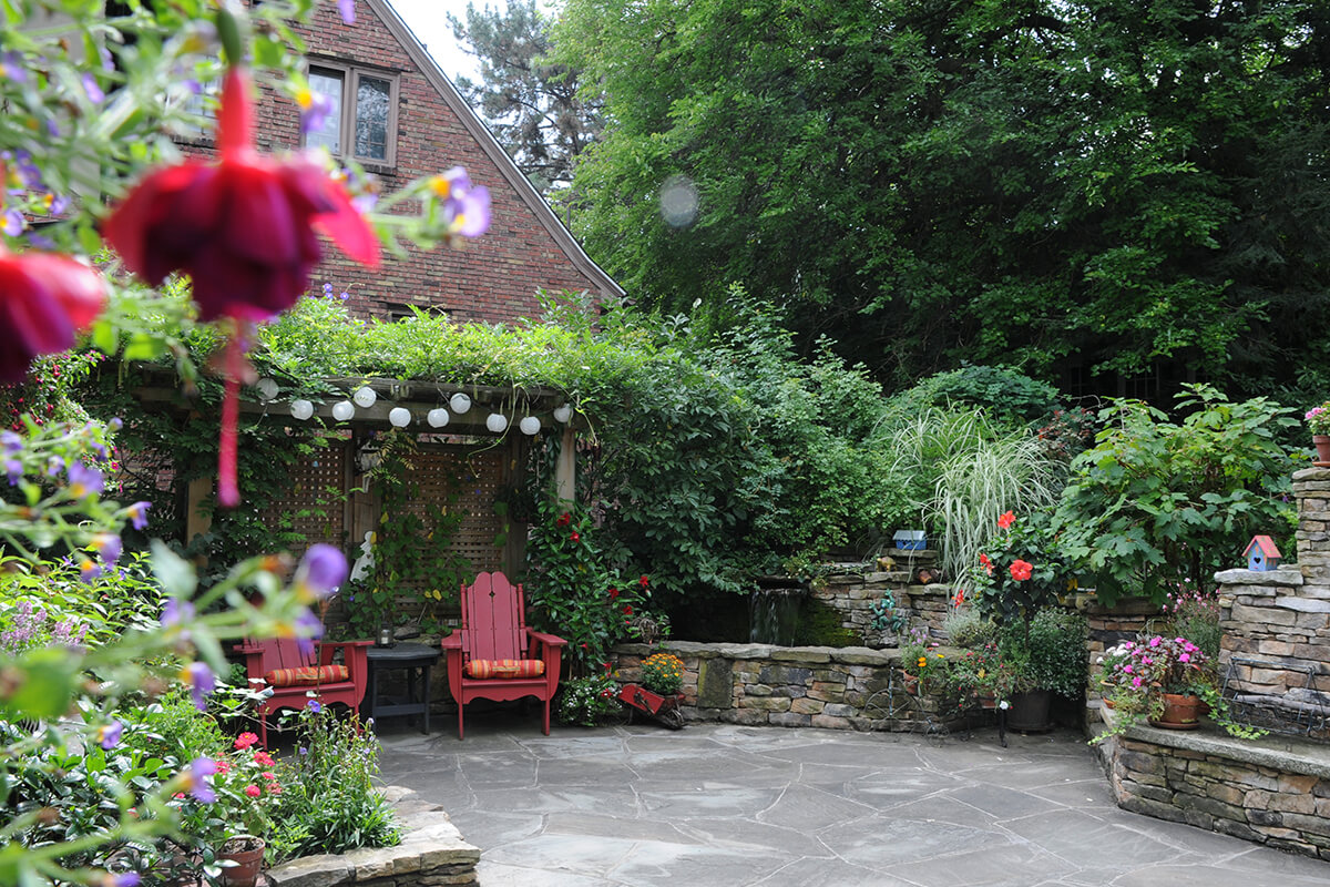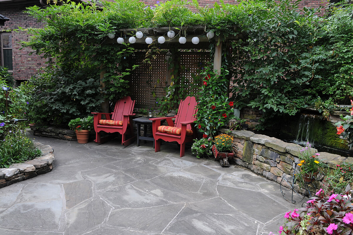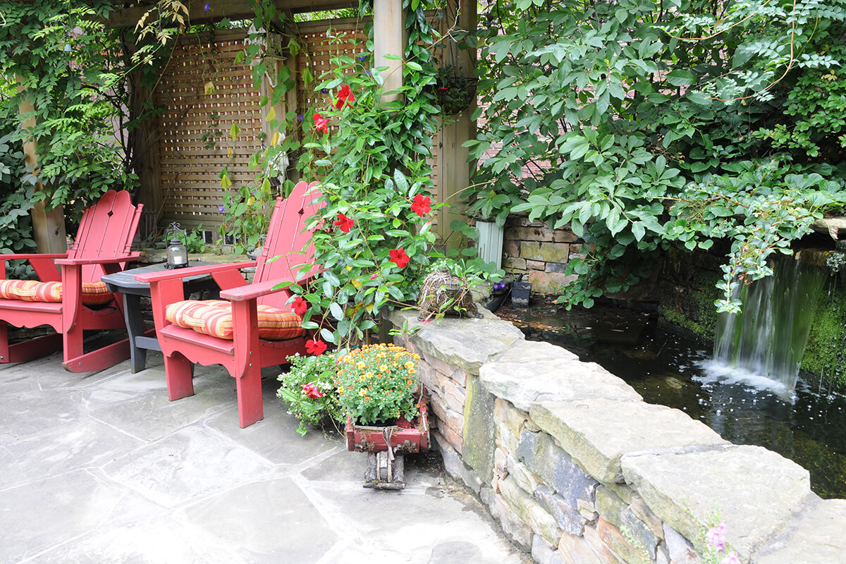 This small urban space was transformed into a charming and inviting garden. Key features of this project include a flagstone patio, a charming fireplace, and vibrant accents throughout. A koi pond and water feature create a relaxing ambiance, while the lush greenery and bright florals provide the perfect escape from the hustle and bustle of city life. City Escape is the perfect project to create your own retreat right in the heart of an urban landscape.