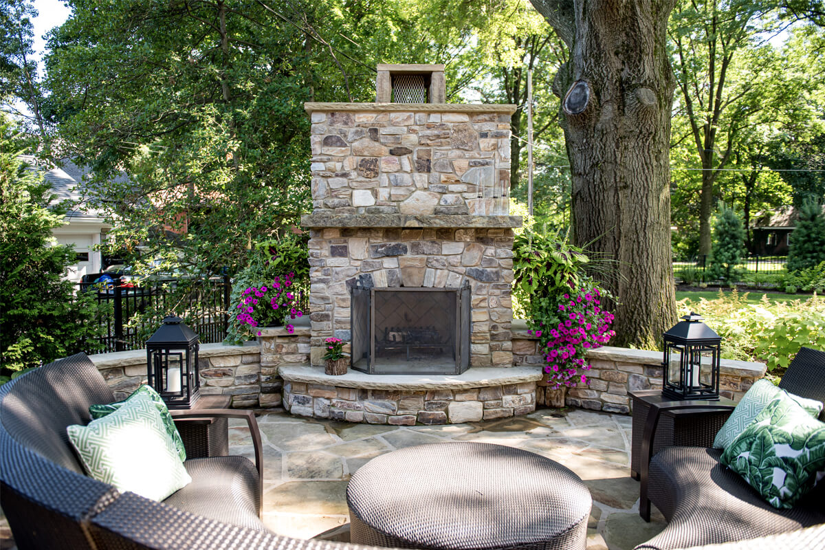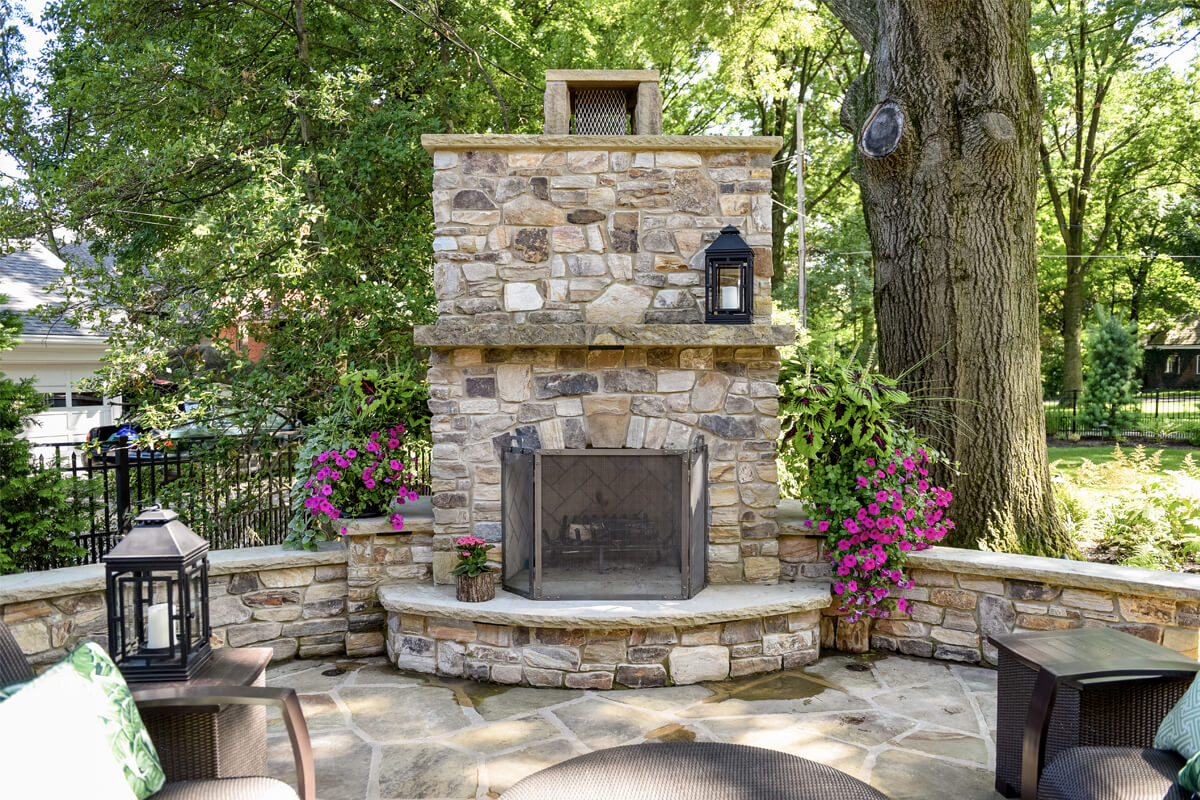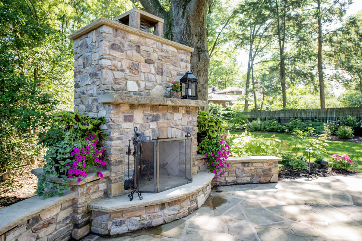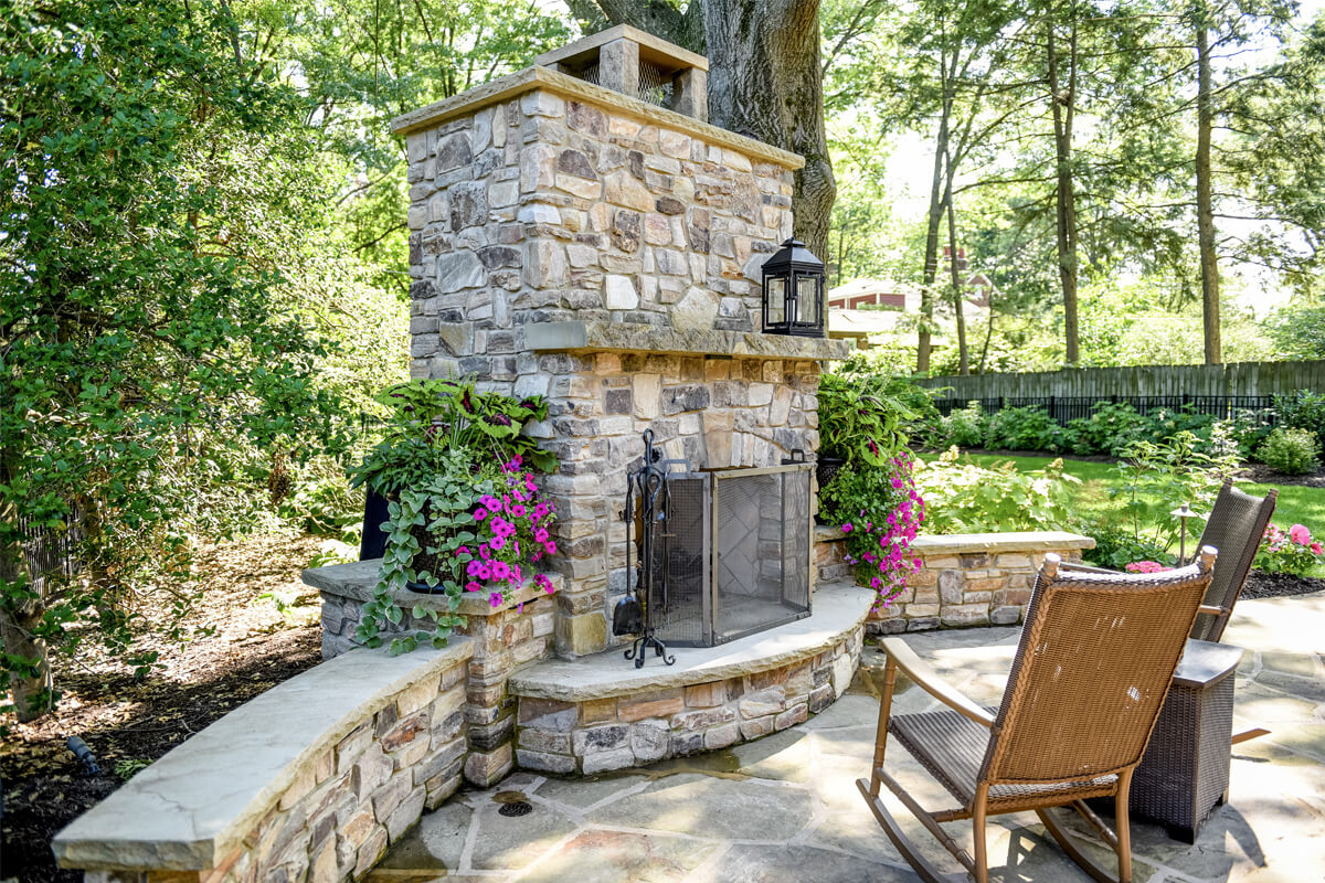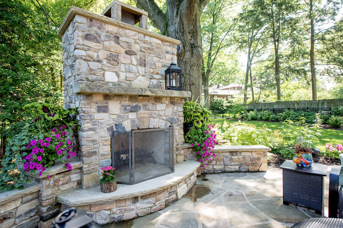 Featuring a timeless design, Fireside Charm is centered around a beautiful stone fireplace. The cozy, intimate seating area is spacious enough to host friends and family. Outdoor fireplaces are perfect for getting maximum use out of your space as warm summer days shorten into chilly autumn nights. The contrast of the greenery and seasonal plants provides harmony and balance to the tranquil space.