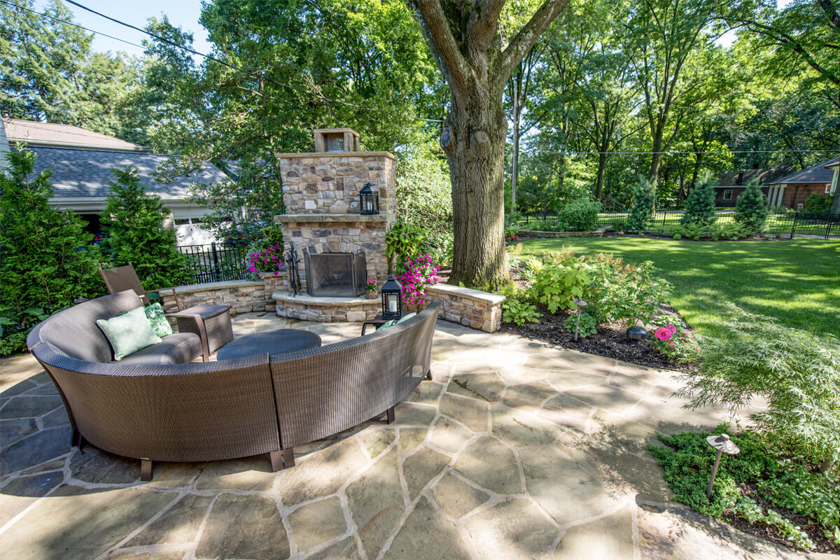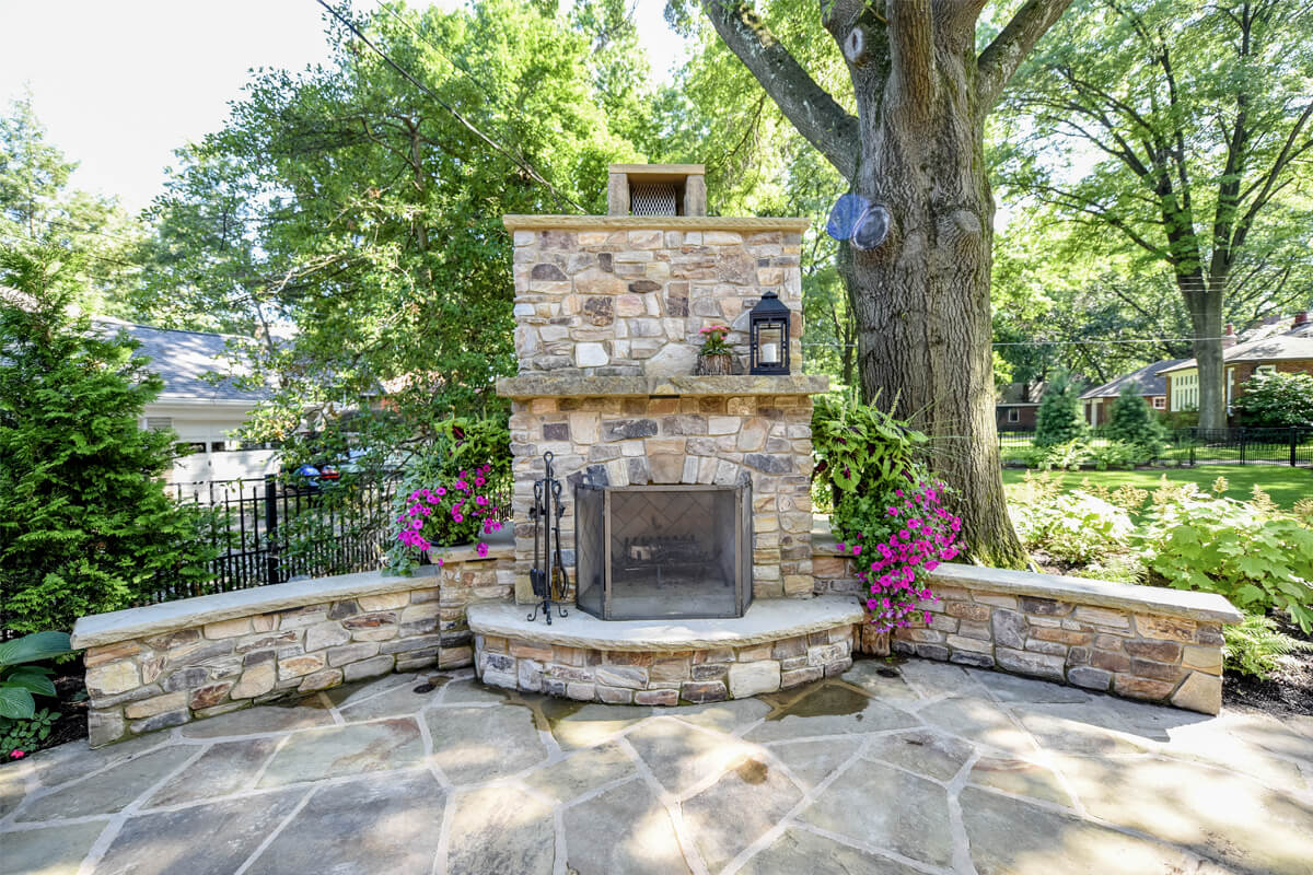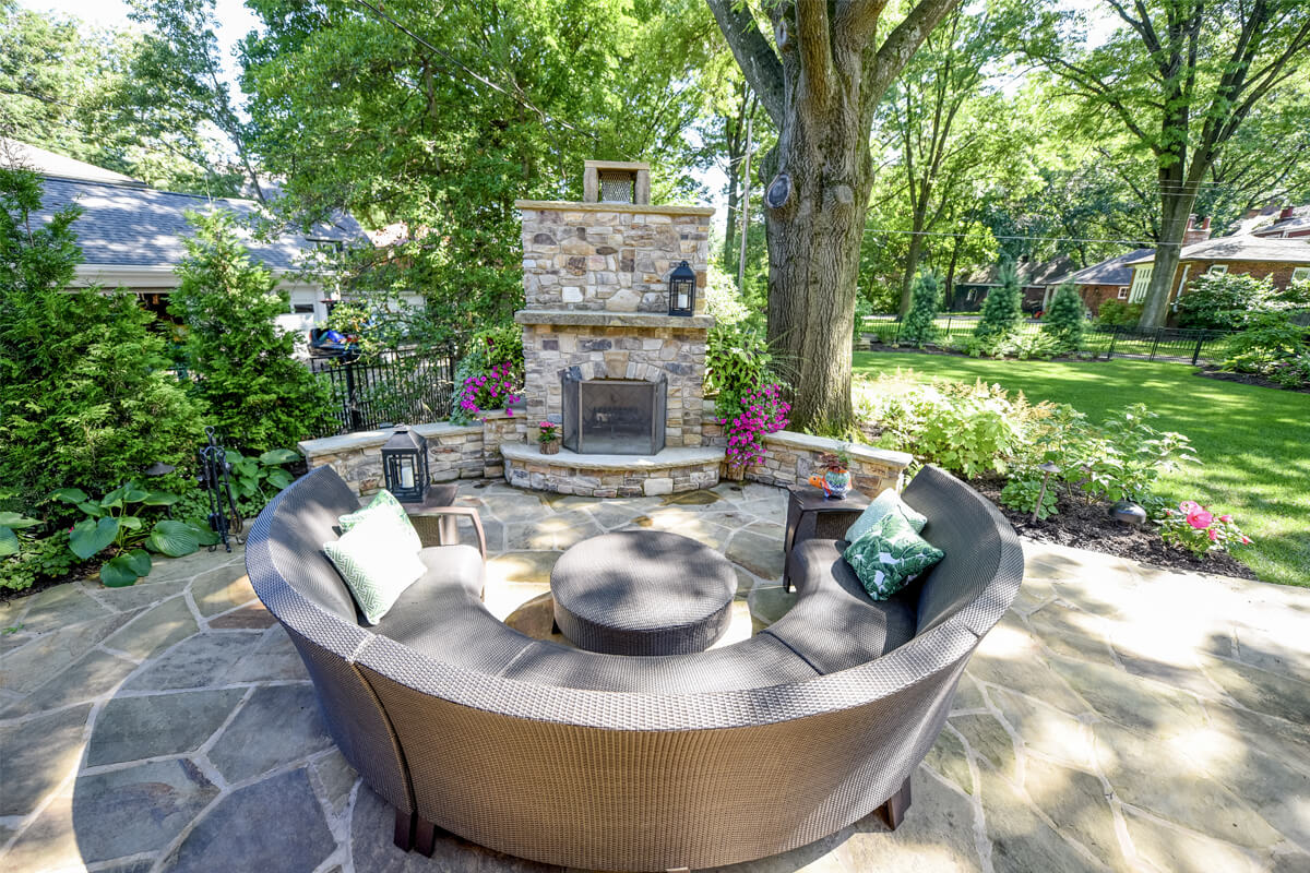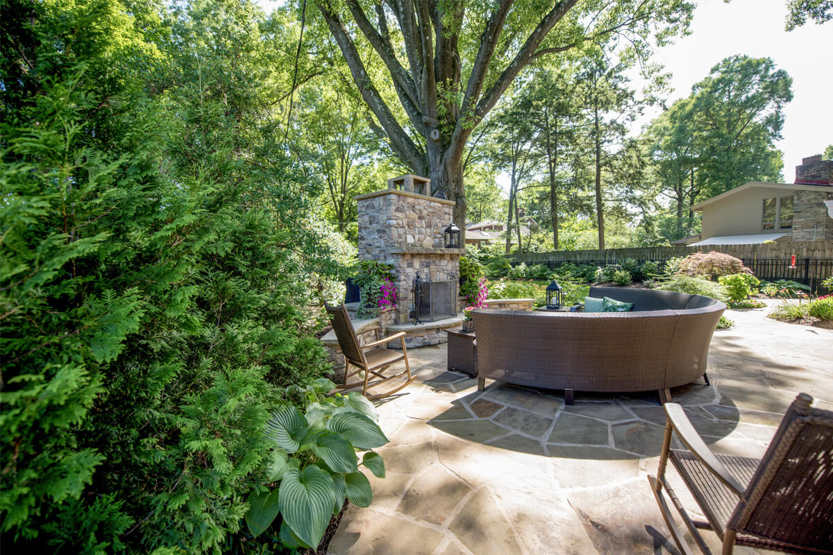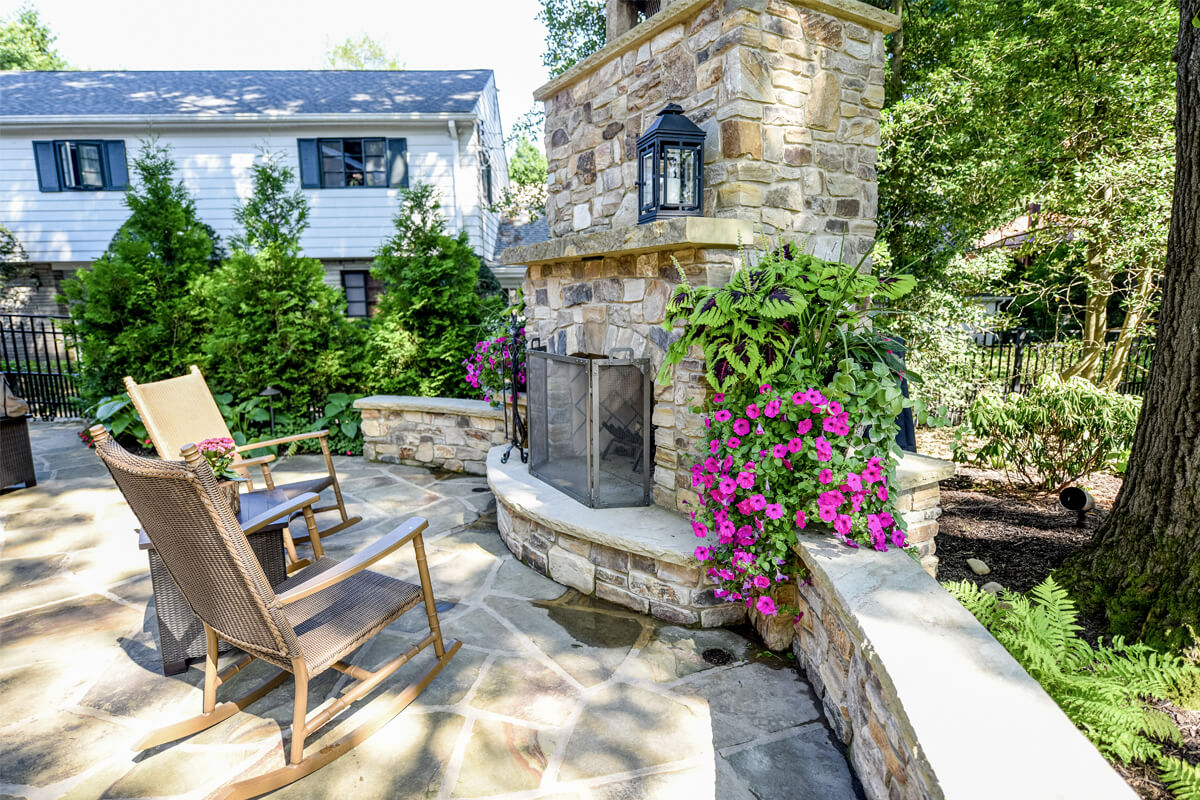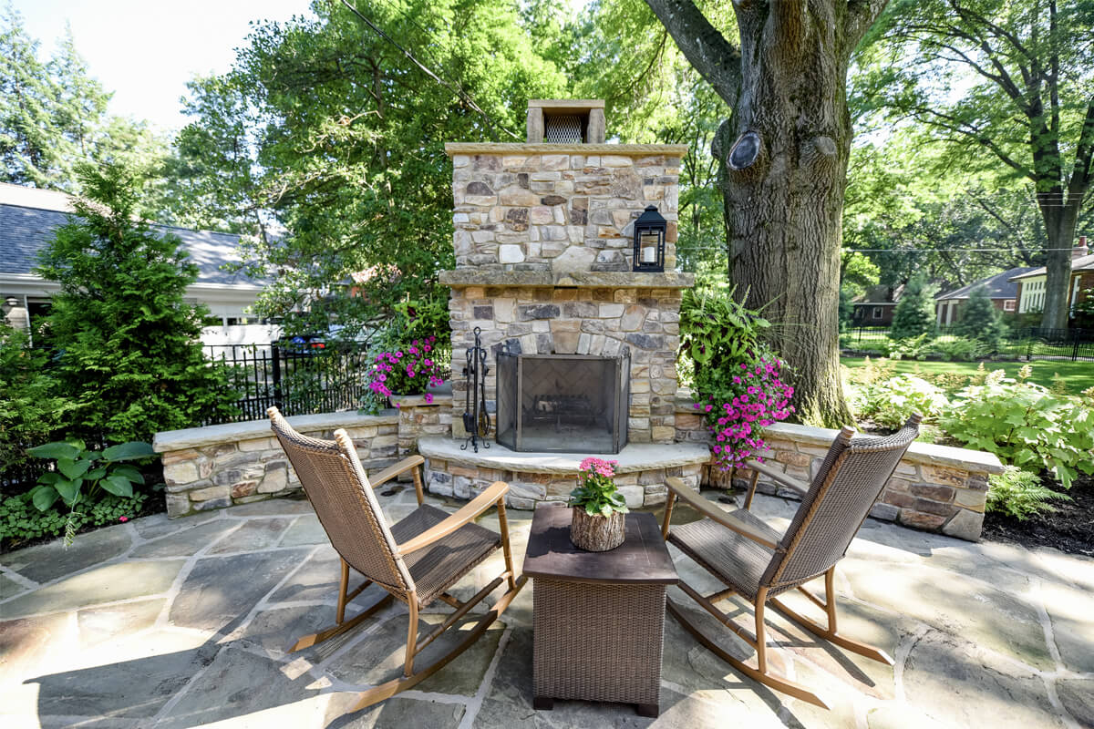 Featuring a timeless design, Fireside Charm is centered around a beautiful stone fireplace. The cozy, intimate seating area is spacious enough to host friends and family. Outdoor fireplaces are perfect for getting maximum use out of your space as warm summer days shorten into chilly autumn nights. The contrast of the greenery and seasonal plants provides harmony and balance to the tranquil space.