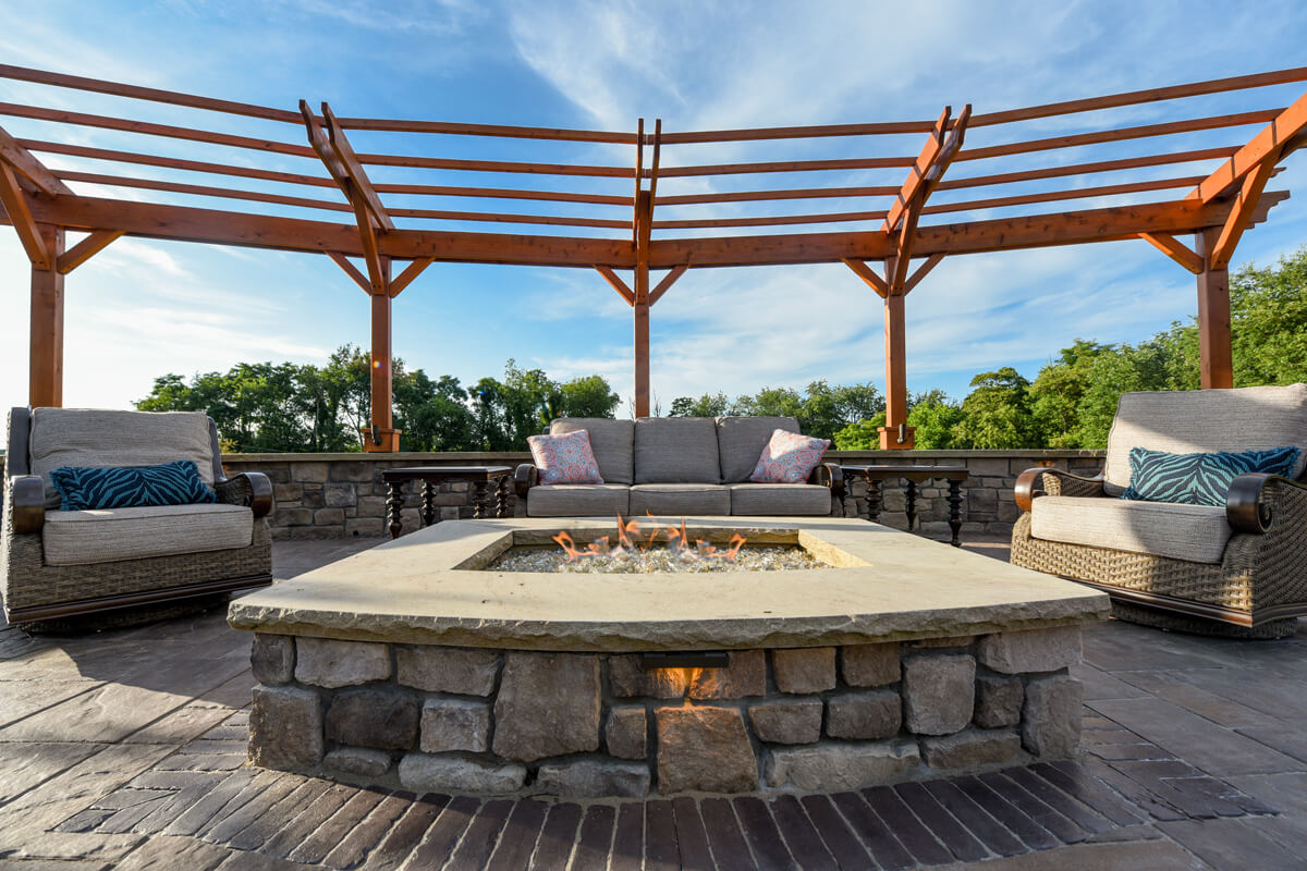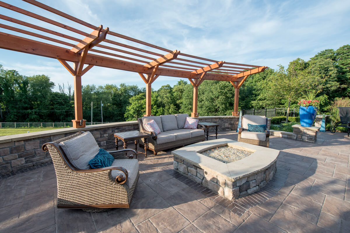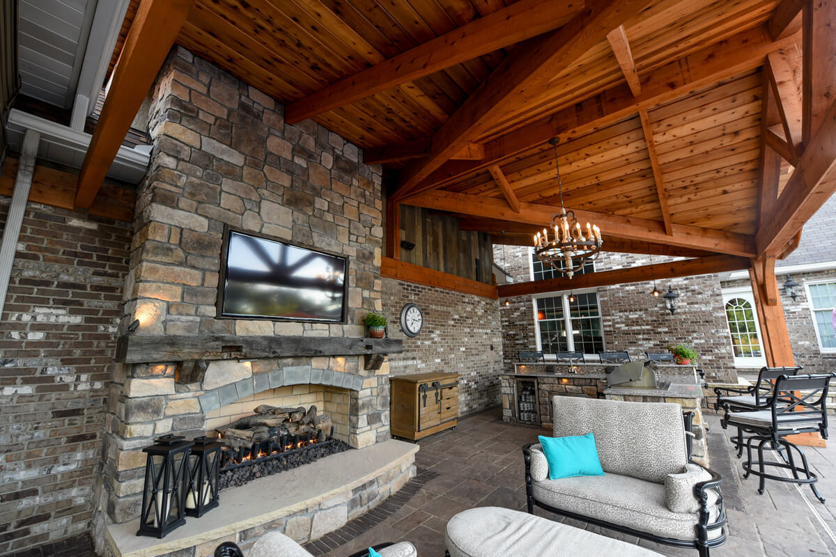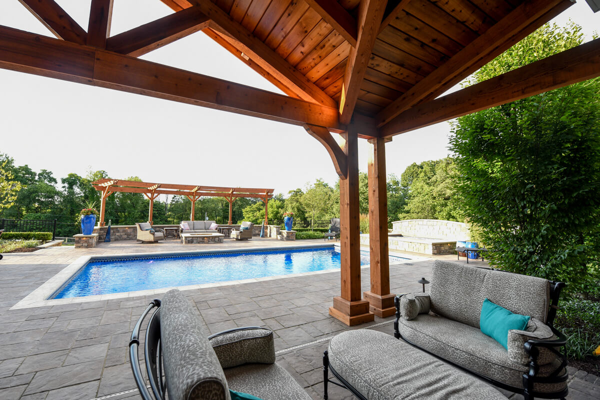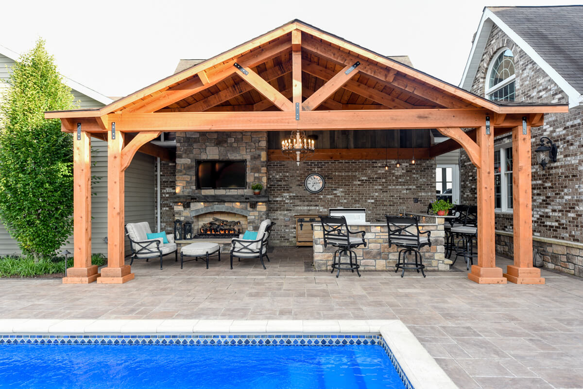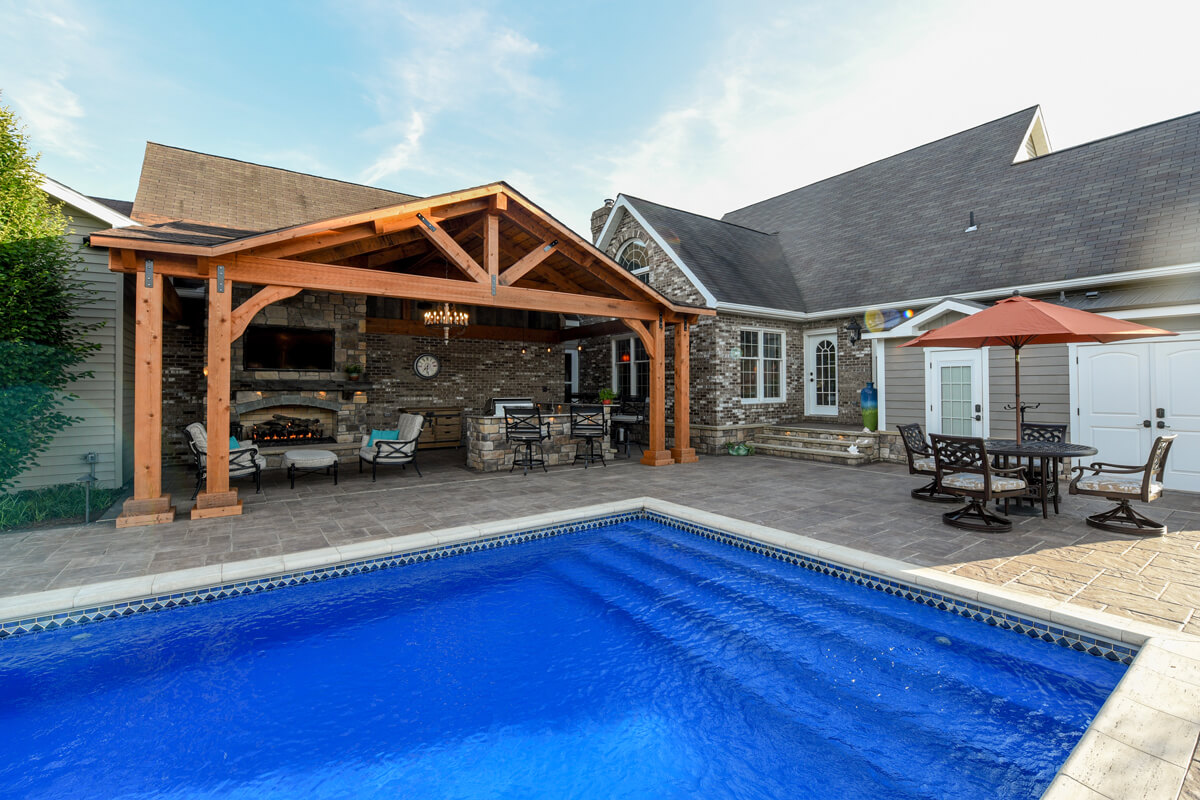 Tranquil Haven transforms a client's rural estate into a luxurious equestrian retreat. Key features of this design include a timber frame structure that houses a beautiful bar and grill, a fireplace, and an outdoor living room. This project also features a swimming pool and a water feature. Additionally, there is a seating area with a gas-powered fire pit. Tranquil Haven offers a perfect balance of functionality and natural beauty