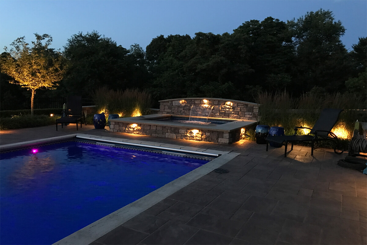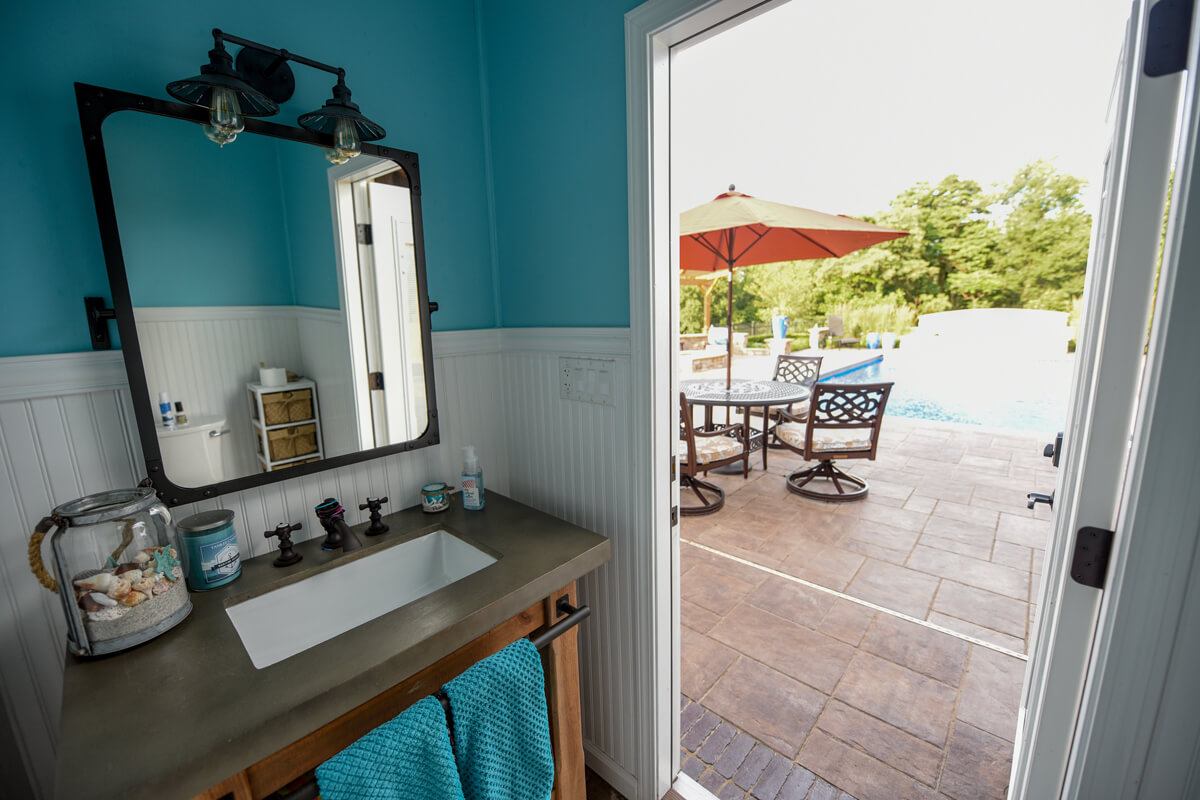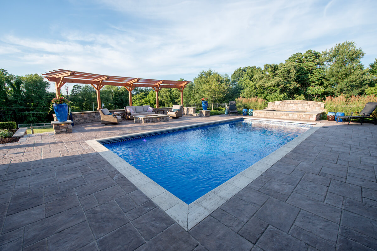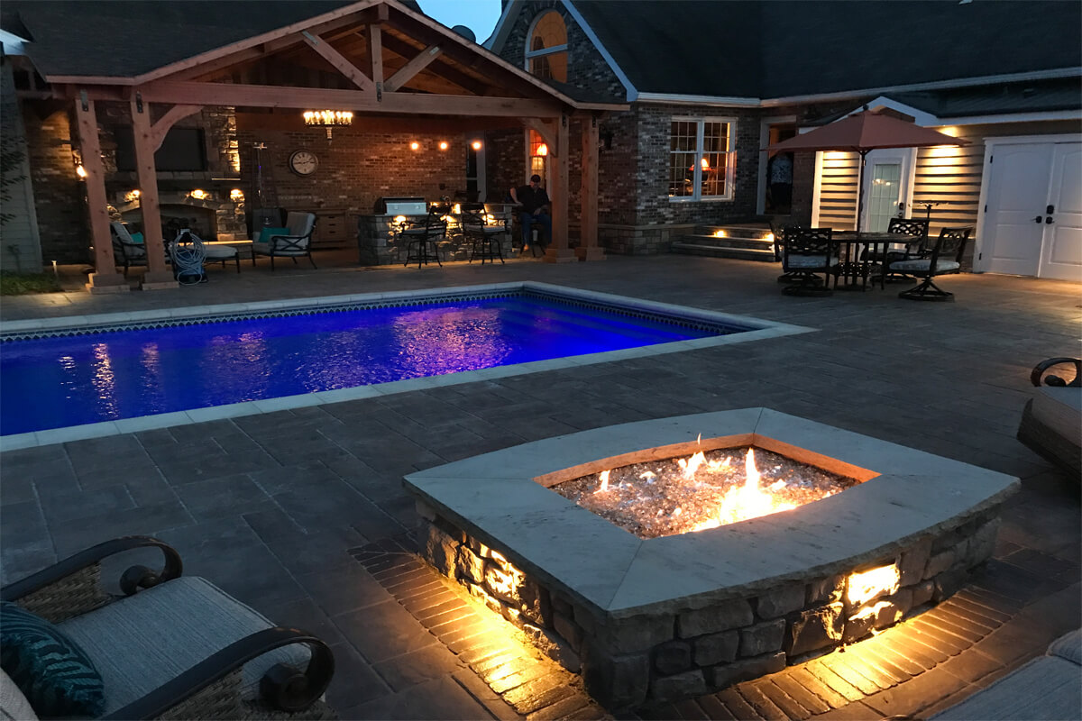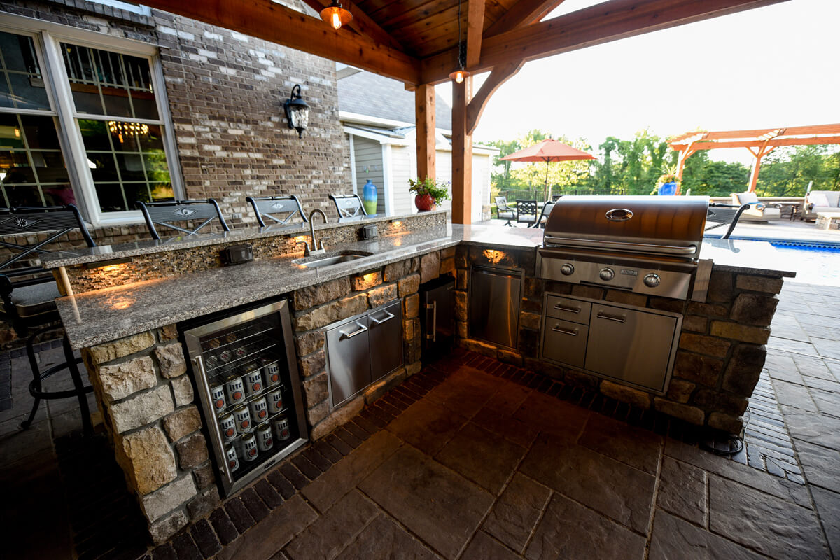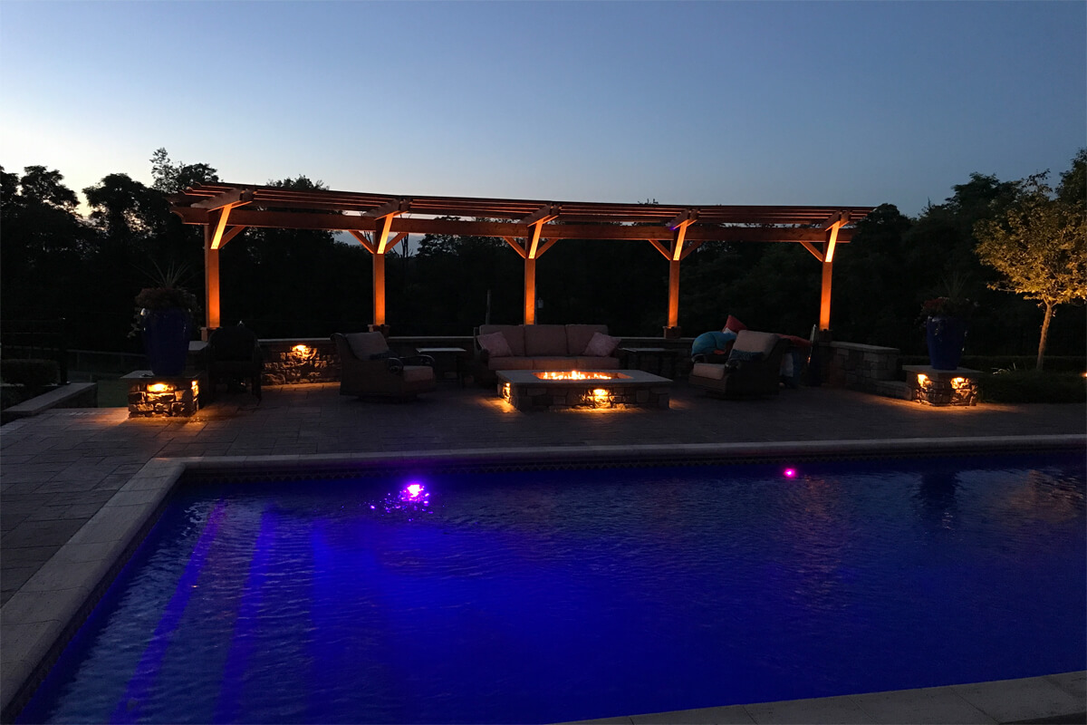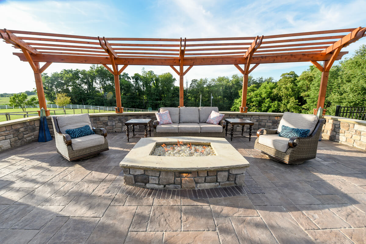 Tranquil Haven transforms a client's rural estate into a luxurious equestrian retreat. Key features of this design include a timber frame structure that houses a beautiful bar and grill, a fireplace, and an outdoor living room. This project also features a swimming pool and a water feature. Additionally, there is a seating area with a gas-powered fire pit. Tranquil Haven offers a perfect balance of functionality and natural beauty